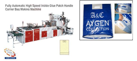 Автоматическая высокоскоростная машина для изготовления пакетов с ручками с усиливающими клеевыми накладками с внутренней стороны.